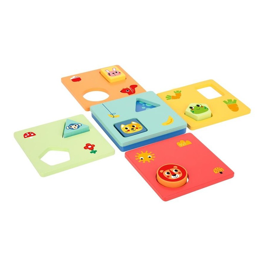 Each wooden piece features a different texture or surface, helping kids develop their sense of touch while sharpening shape recognition.