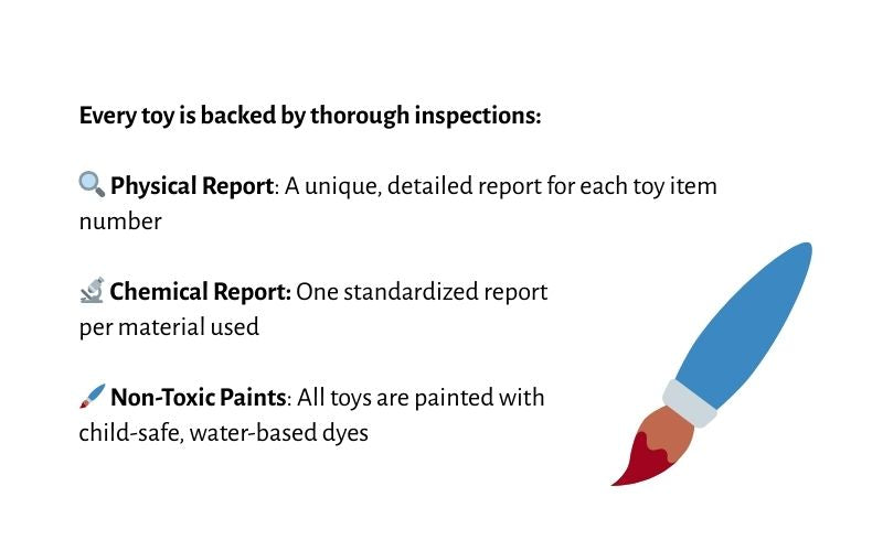 Yes, our first priority is making sure our toys are safe. To provide our clients toys that are safe for kids to play with, we are dedicated to meeting and surpassing all safety requirements and standards. Throughout the manufacturing process, our toys are subjected to stringent quality control standards and rigorous testing.