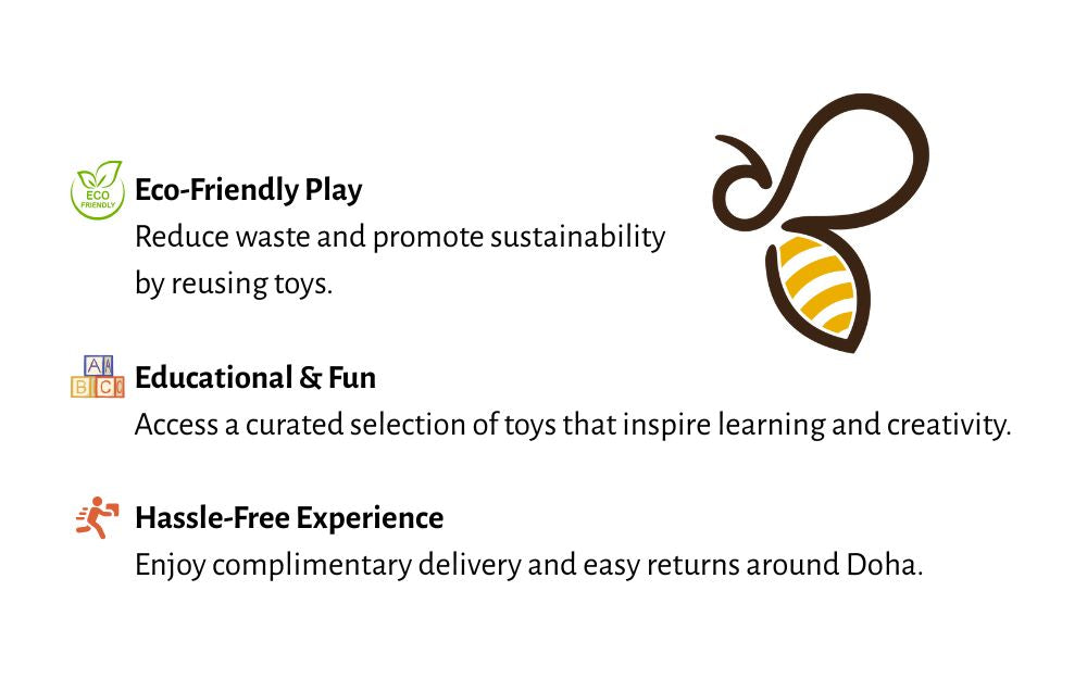 WanderBee is a convenient and eco-friendly toy rental service in Doha, Qatar, designed to bring joy and variety to your child's playtime. We provide a wide range of high-quality, age-appropriate toys that can be easily rented and swapped, allowing families to explore new toys without the clutter and expense of buying new ones. Our mission is to make playtime fun, sustainable, and accessible for every family.